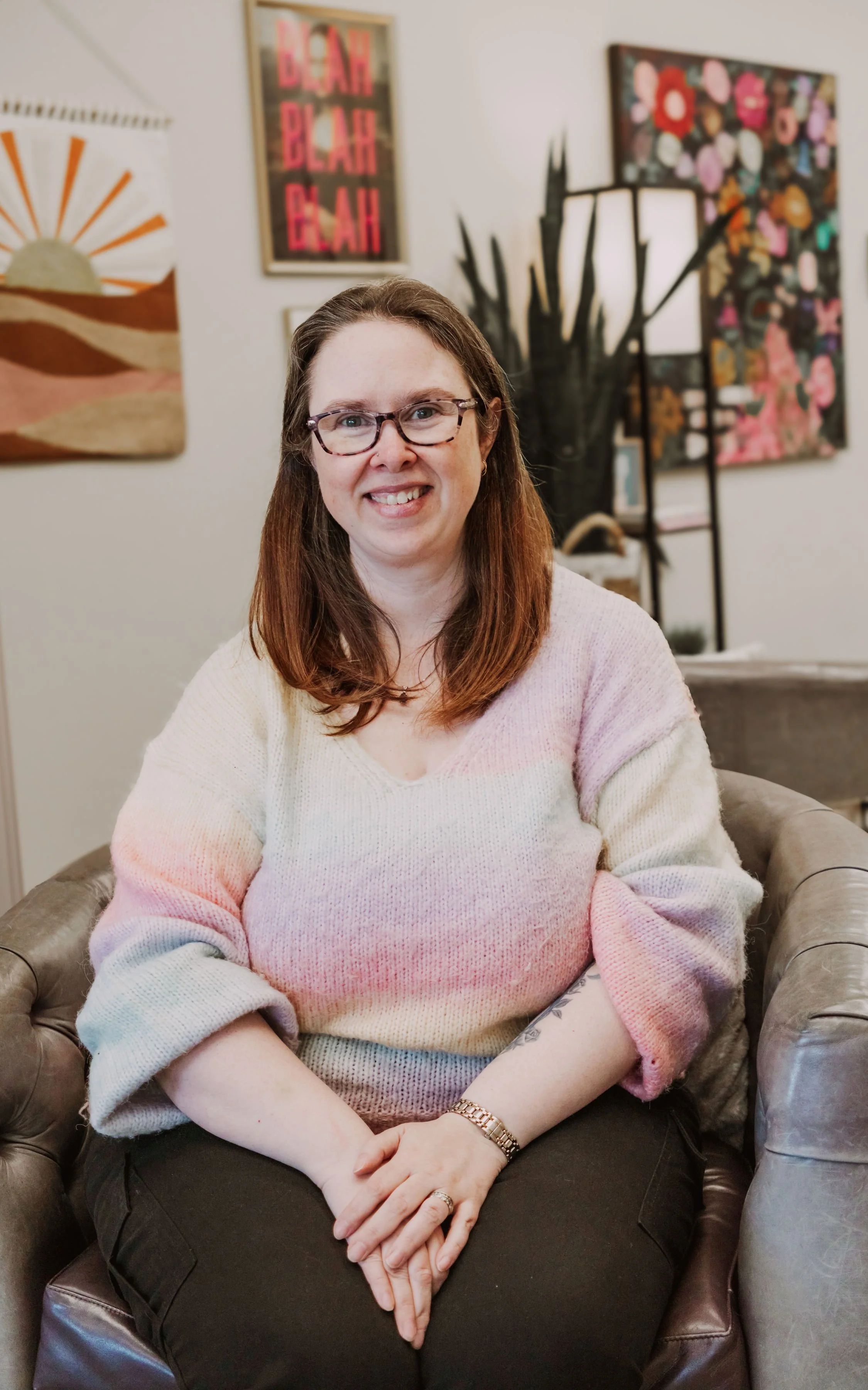 When I’m not in the studio with clients, you’ll probably find me running, painting, or curled up with a good book. I’m also a proud cat mom to Bean, who is just as curious and playful as I am! Wherever you are in your journey, I’d love to walk alongside you and create a space where you feel safe, seen, and supported.